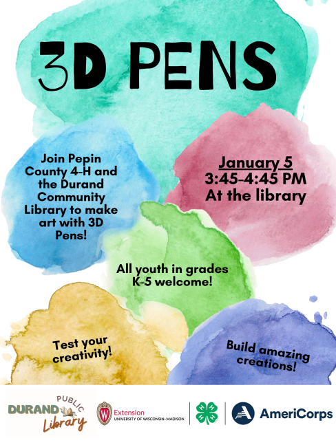 Join Pepin County 4-H and the Durand Community Library to create art with awesome 3D Pens!