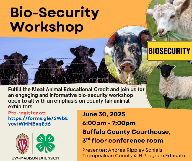 Fulfill the Meat Animal Educational Credit and join us for an engaging and informative bio-security workshop open to all with an emphasis on county fair animal exhibitors. This will fulfill the Meat Animal Educational Credit once the form has been submitted. Presented by: Andrea Rippley Schlais, Trempealeau County 4-H Program Educator.